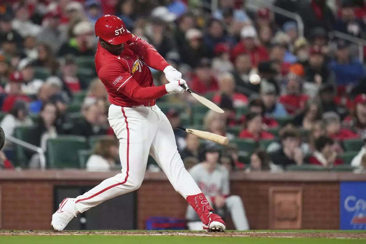 St. Louis Cardinals' Jordan Walker breaks his bat flying out during the third inning of a baseball game against the Philadelphia Phillies Friday, April 11, 2025, in St. Louis. (AP Photo/Jeff Roberson)