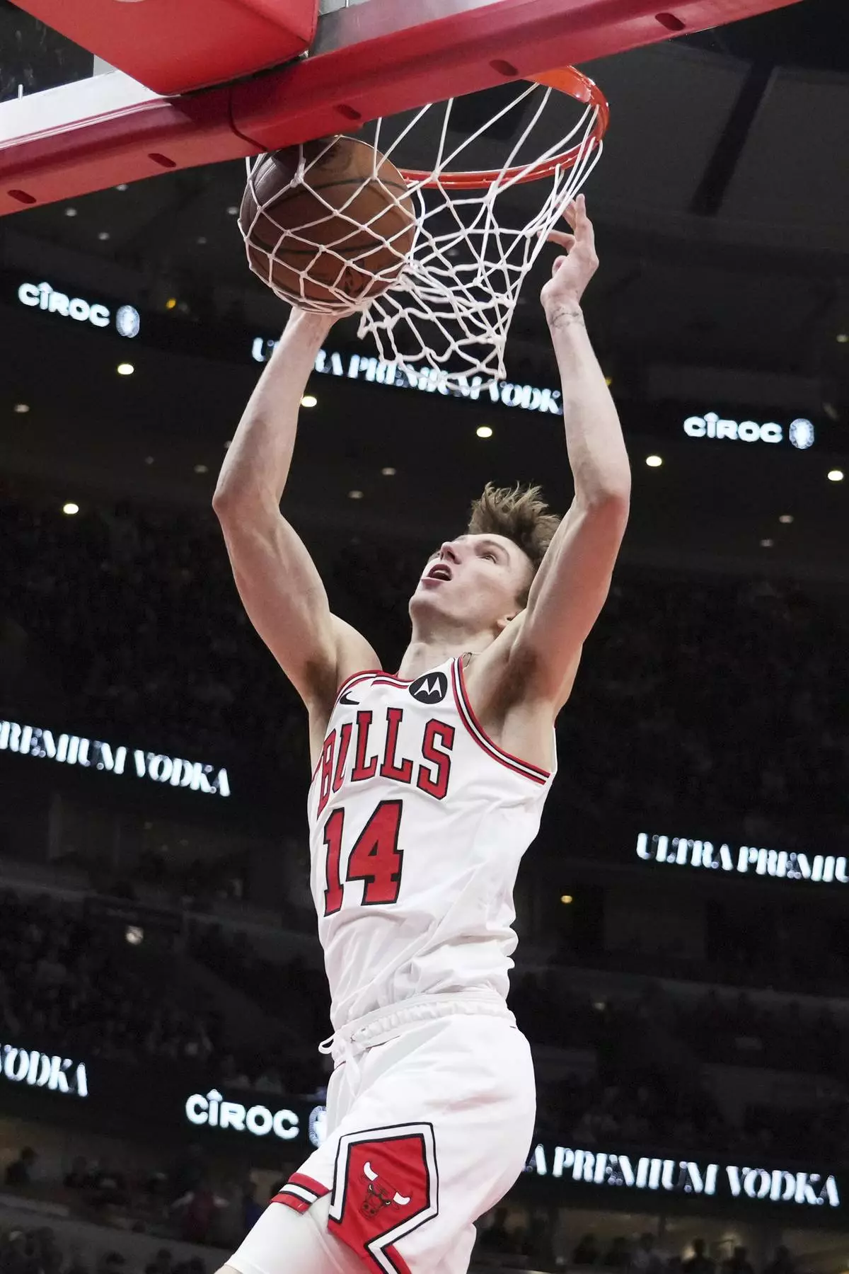 Chicago Bulls forward Matas Buzelis (14) hangs from the rim after dunking during the second half of an NBA basketball game against the Washington Wizards in Chicago, Friday, April 11, 2025. (AP Photo/Nam Y. Huh)