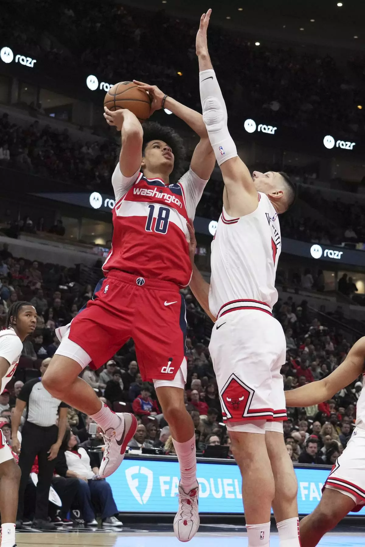 Washington Wizards forward Kyshawn George (18) shoots against Chicago Bulls center Nikola Vucevic, right, during the first half of an NBA basketball game in Chicago, Friday, April 11, 2025. (AP Photo/Nam Y. Huh)
