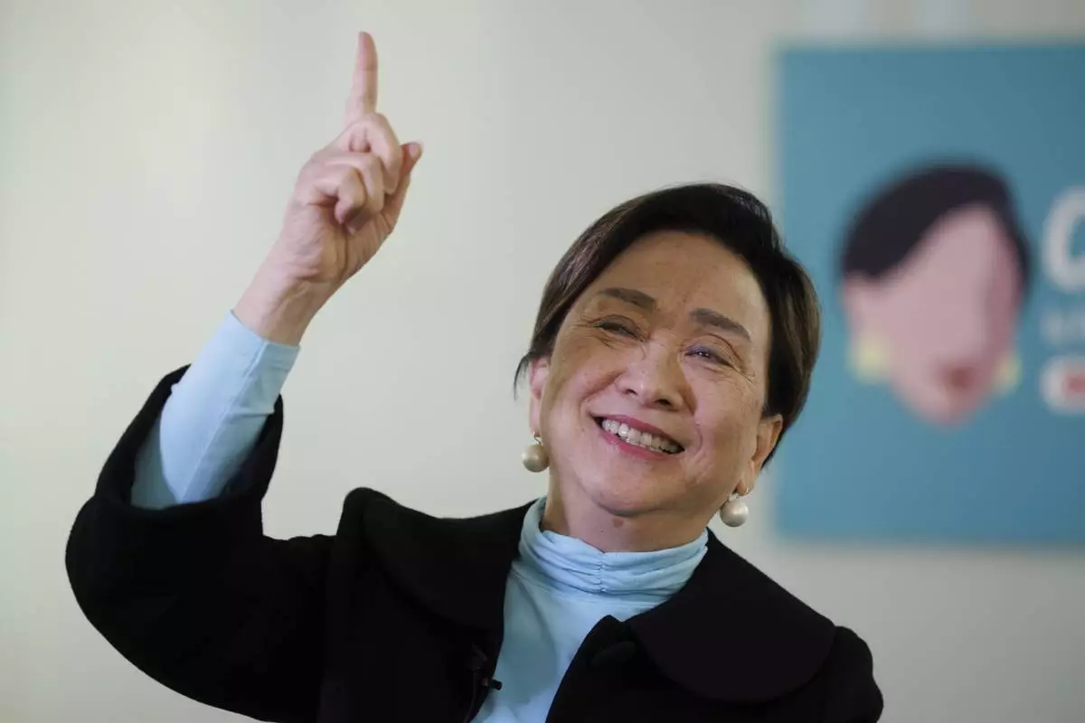 Emily Lau, former chairperson of the Democratic Party, reacts during the interview at the Democratic Party's office in Prince Edward in Hong Kong on April 2, 2025. (AP Photo/May James)