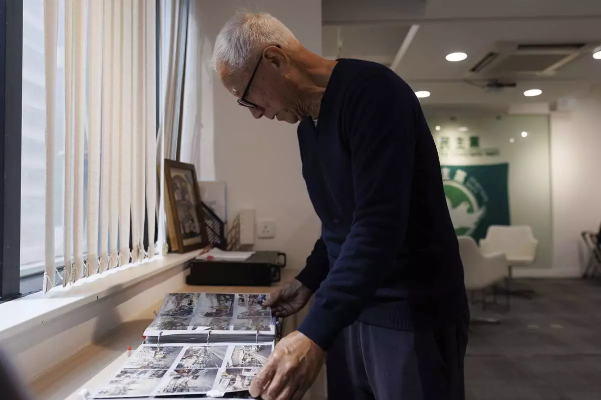 Yeung Sum, the founding member of the Democratic Party, looks through old pictures at the Democratic Party's office in Prince Edward in Hong Kong on April 2, 2025. (AP Photo/May James)