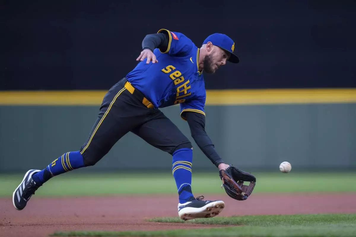 Seattle Mariners third baseman Miles Mastrobuoni fields a ground ball during the first inning of a baseball game against the Texas Rangers, Friday, April 11, 2025, in Seattle. (AP Photo/Stephen Brashear)