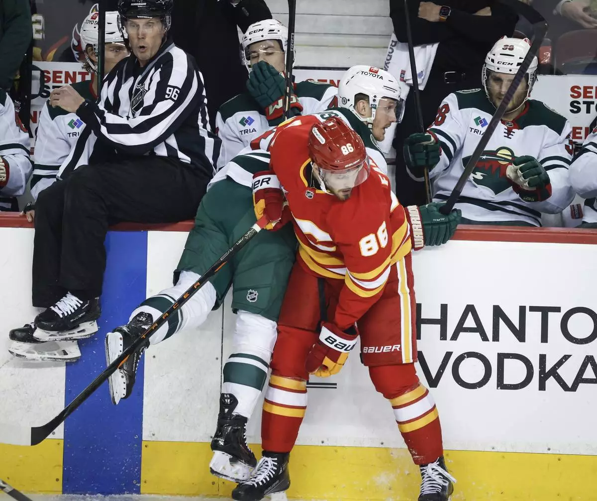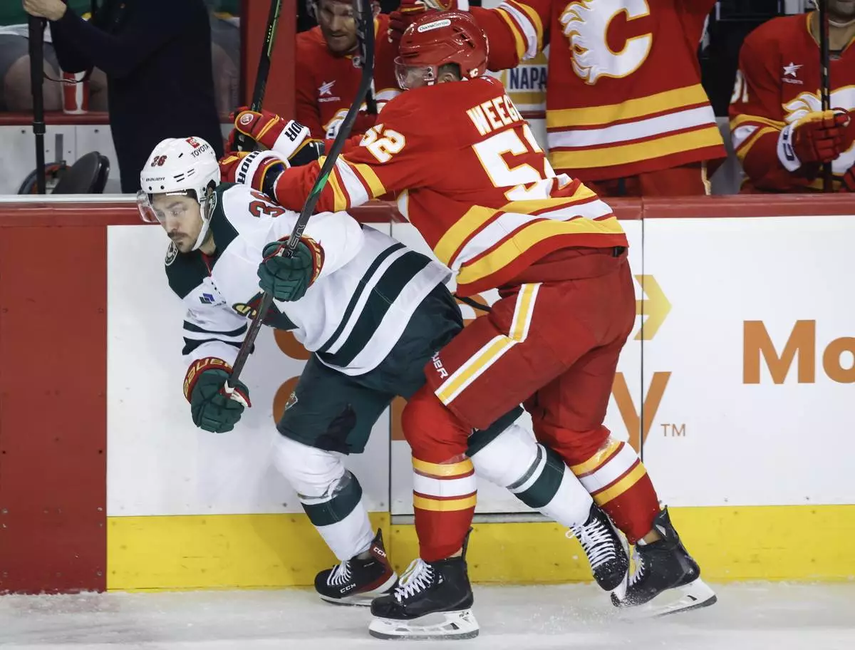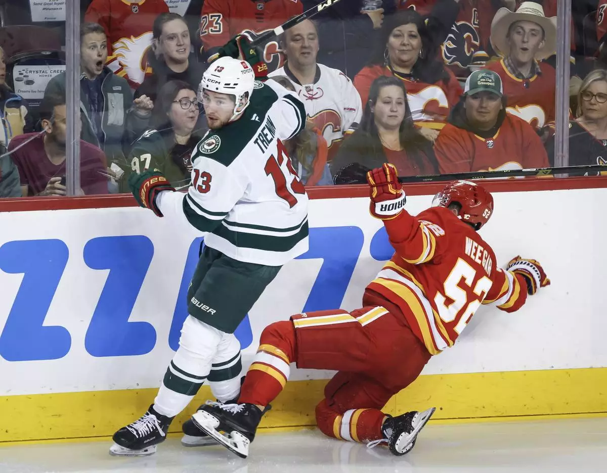 Minnesota Wild's Yakov Trenin (13) checks Calgary Flames' MacKenzie Weegar (52) during the first period of an NHL hockey game in Calgary, Alberta, Friday, April 11, 2025. (Jeff McIntosh/The Canadian Press via AP)