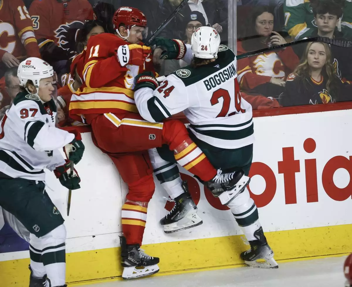 Minnesota Wild's Zach Bogosian (24) checks Calgary Flames' Mikael Backlund (11) during the second period of an NHL hockey game in Calgary, Alberta, Friday, April 11, 2025. (Jeff McIntosh/The Canadian Press via AP)