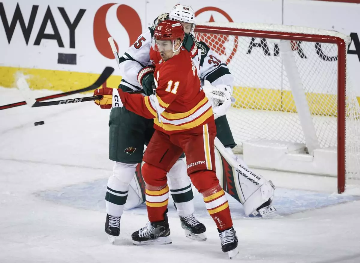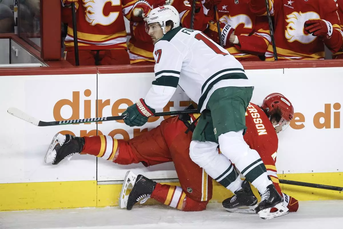 Minnesota Wild's Marcus Foligno (17) checks Calgary Flames' Rasmus Andersson (4) during the first period of an NHL hockey game in Calgary, Alberta, Friday, April 11, 2025. (Jeff McIntosh/The Canadian Press via AP)
