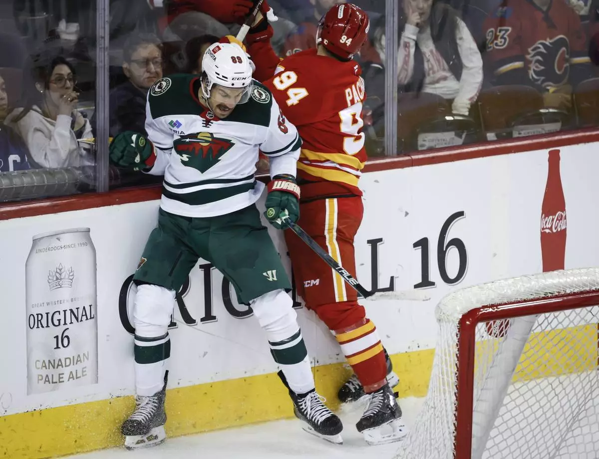 Minnesota Wild's Mats Zuccarello (36) is checked by Calgary Flames' MacKenzie Weegar (52) during the first period of an NHL hockey game in Calgary, Alberta, Friday, April 11, 2025. (Jeff McIntosh/The Canadian Press via AP)