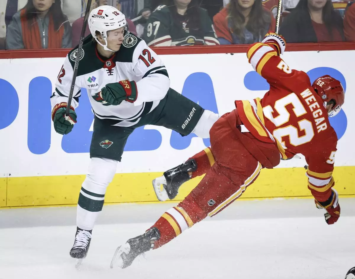 Minnesota Wild's Matt Boldy (12) checks Calgary Flames' MacKenzie Weegar (52) during the first period of an NHL hockey game in Calgary, Alberta, Friday, April 11, 2025. (Jeff McIntosh/The Canadian Press via AP)