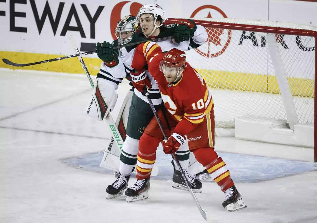 Minnesota Wild's Brock Faber (7) tangles with Calgary Flames' Jonathan Huberdeau (10) in front of goalie Filip Gustavsson (32) during the second period of an NHL hockey game in Calgary, Alberta, Friday, April 11, 2025. (Jeff McIntosh/The Canadian Press via AP)