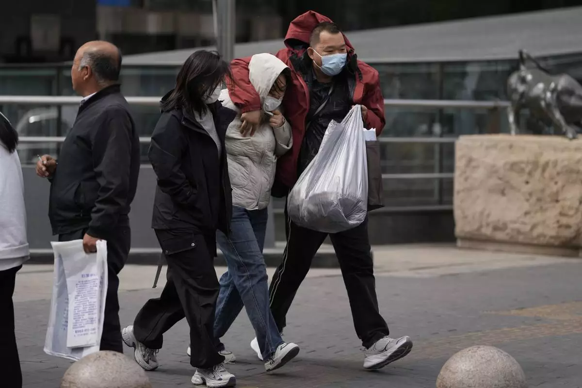 Residents walk against strong winds in Beijing, China, Saturday, April 12, 2025. (AP Photo/Ng Han Guan)