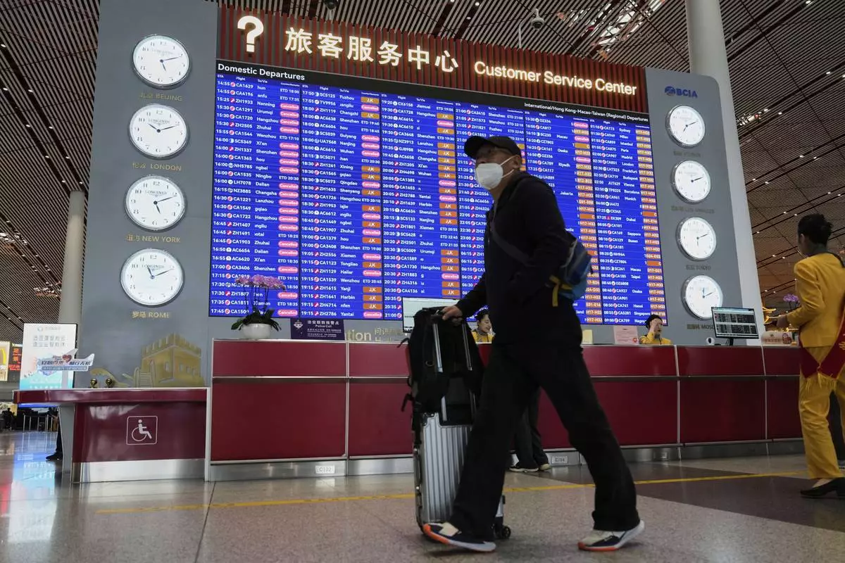 A traveller walks past by a board showing flights that are cancelled at the Capital International Airport Terminal 3 following gale wind alerts in Beijing, China, Saturday, April 12, 2025. (AP Photo/Ng Han Guan)