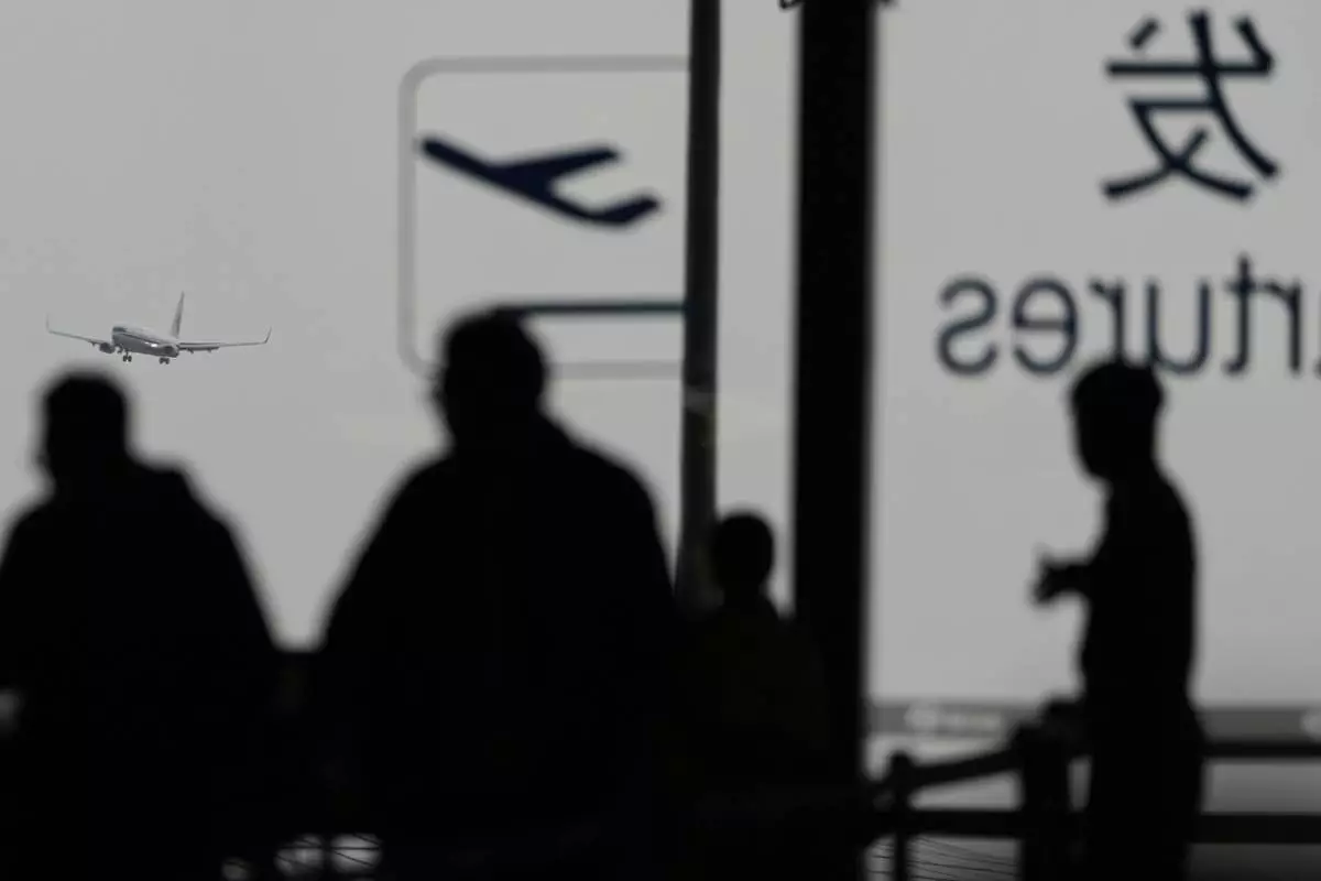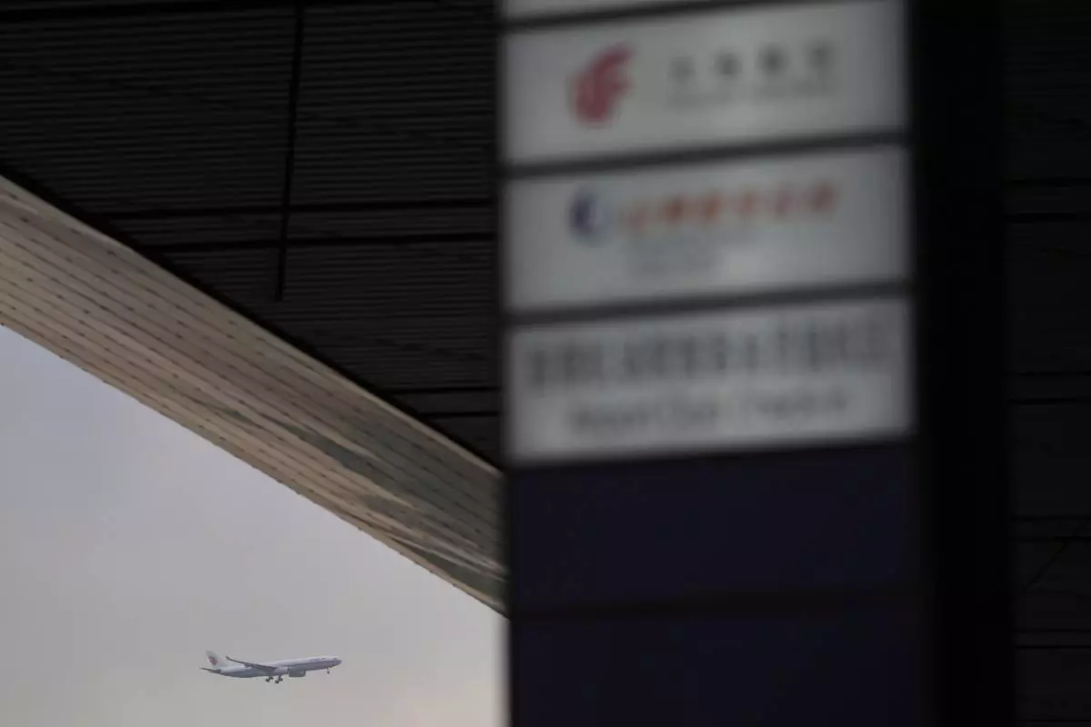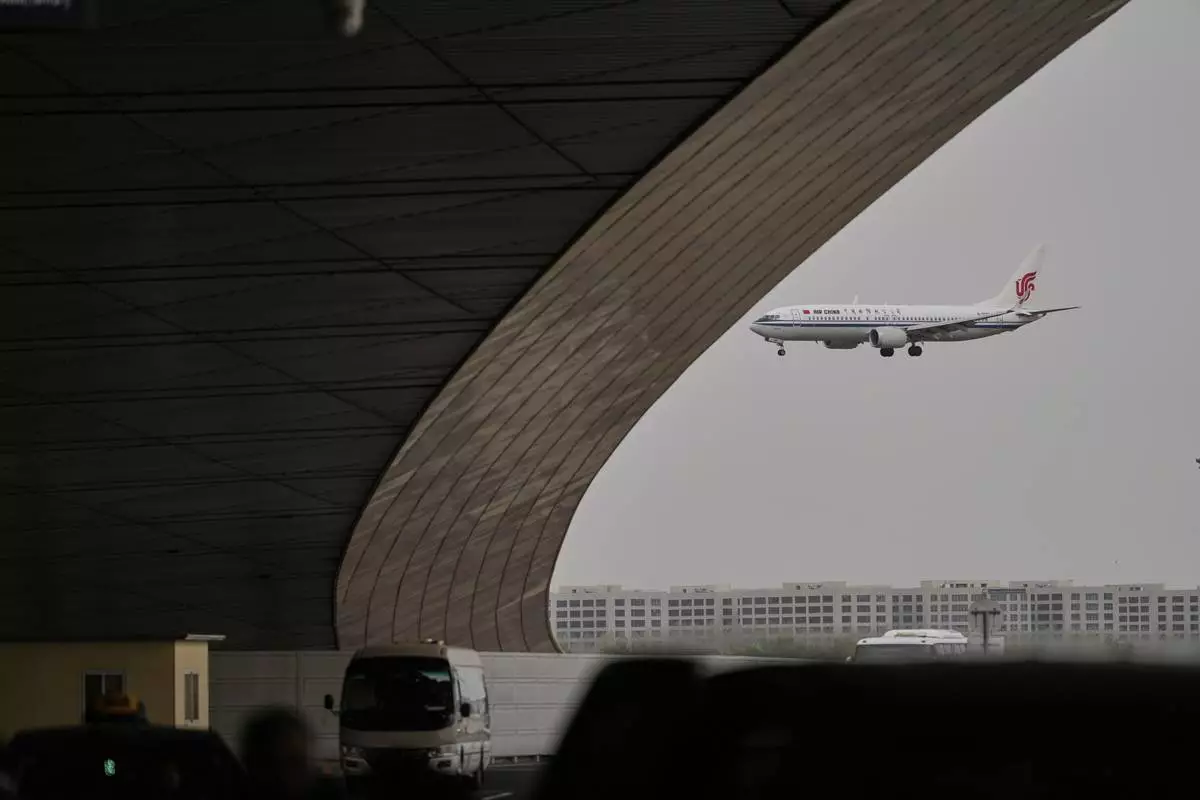 An Air China passenger jet prepares to land at the Beijing Capital International Airport Terminal 3 as gale wind alerts cancelled flights in Beijing, China, Saturday, April 12, 2025. (AP Photo/Ng Han Guan)