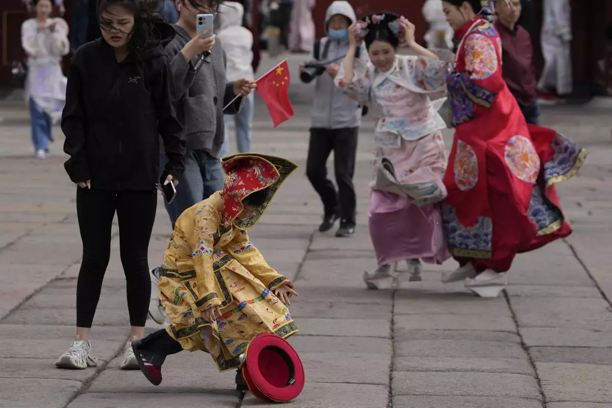A child dressed as the emperor reacts after retrieving his crown blown away outside the Forbidden City during high winds in Beijing, China, Saturday, April 12, 2025. (AP Photo/Ng Han Guan)