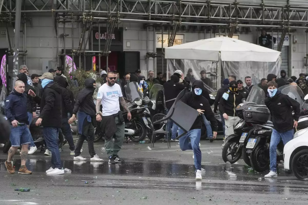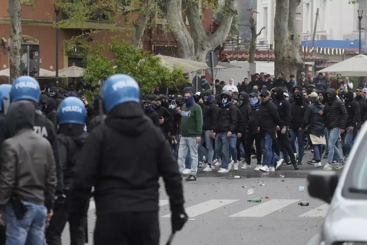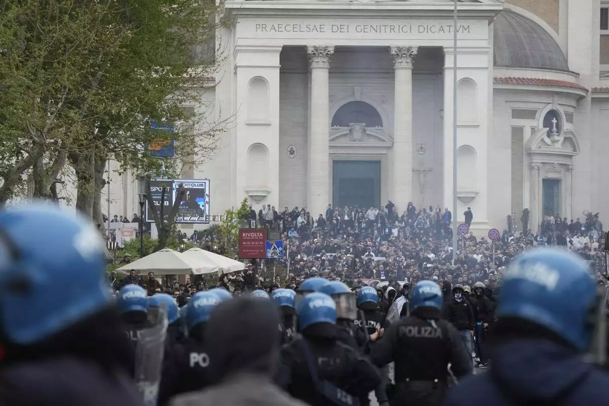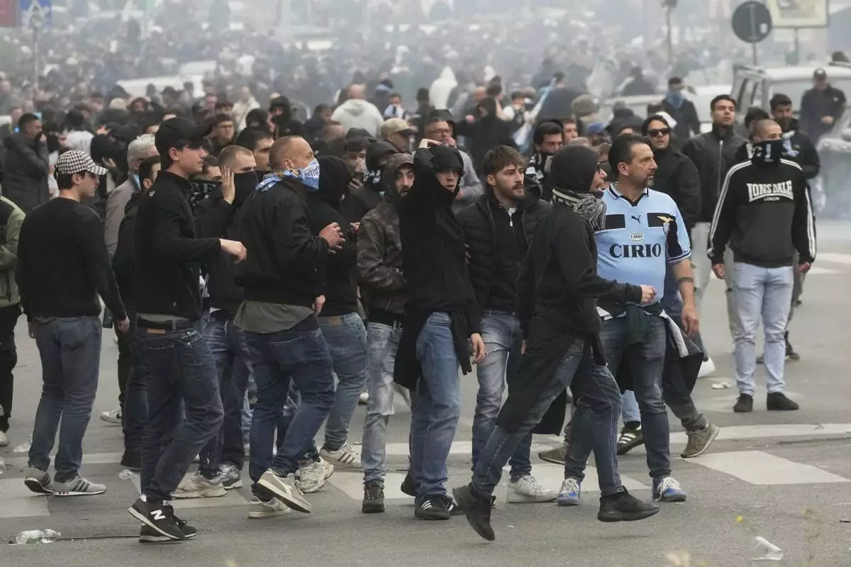 Lazio fans riot with police ahead of the Italian Serie A soccer match between Lazio and Roma at Rome's Olympic stadium, Sunday, April 13, 2025. (AP Photo/Gregorio Borgia)