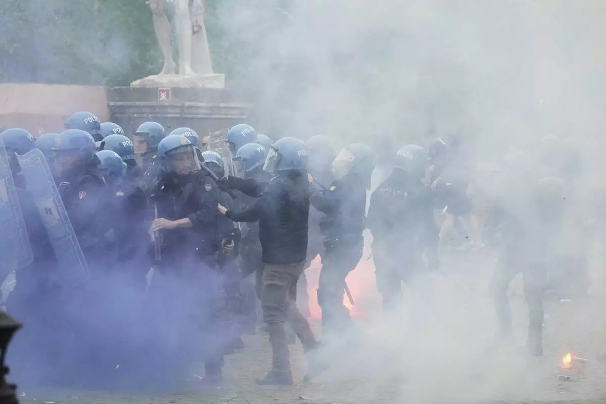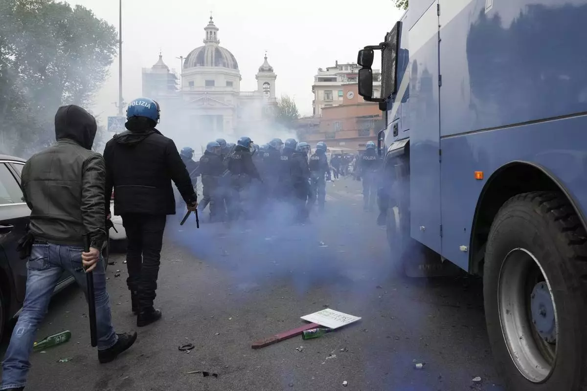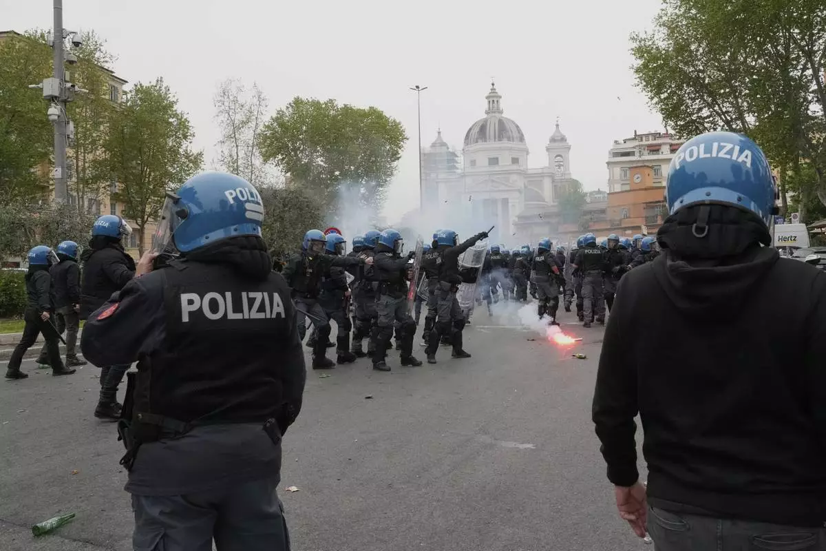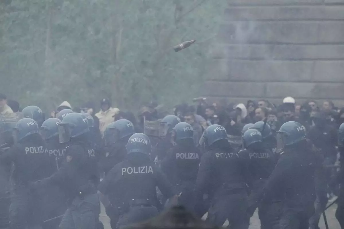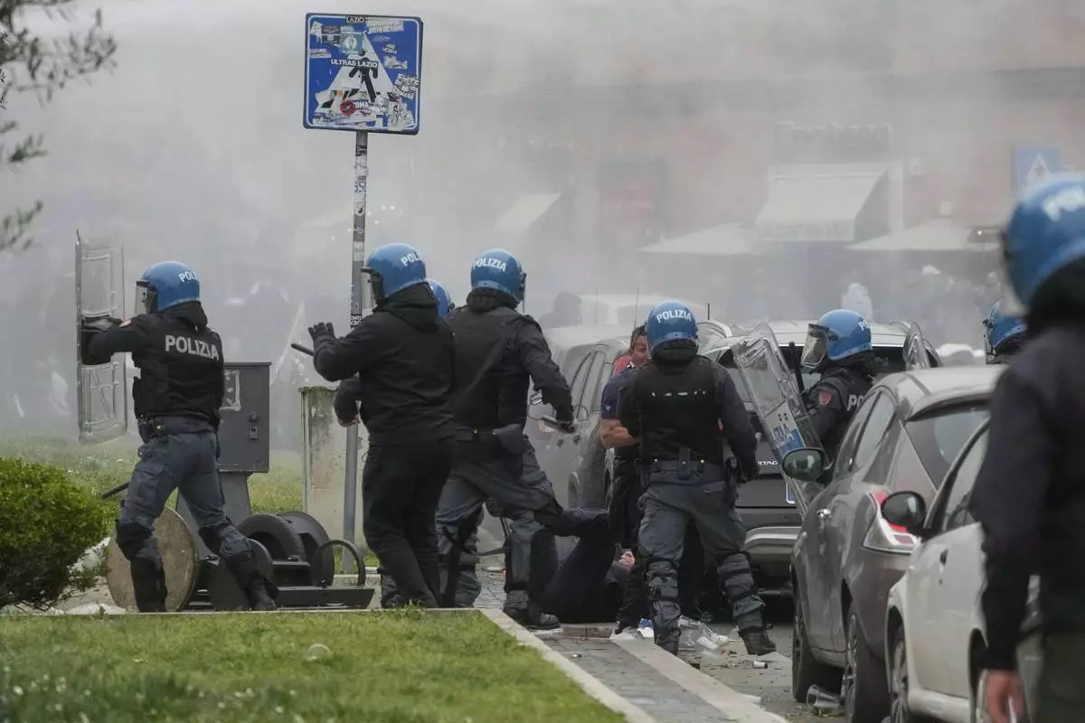 Lazio fans riot with police ahead of the Italian Serie A soccer match between Lazio and Roma at Rome's Olympic stadium, Sunday, April 13, 2025. (AP Photo/Gregorio Borgia)