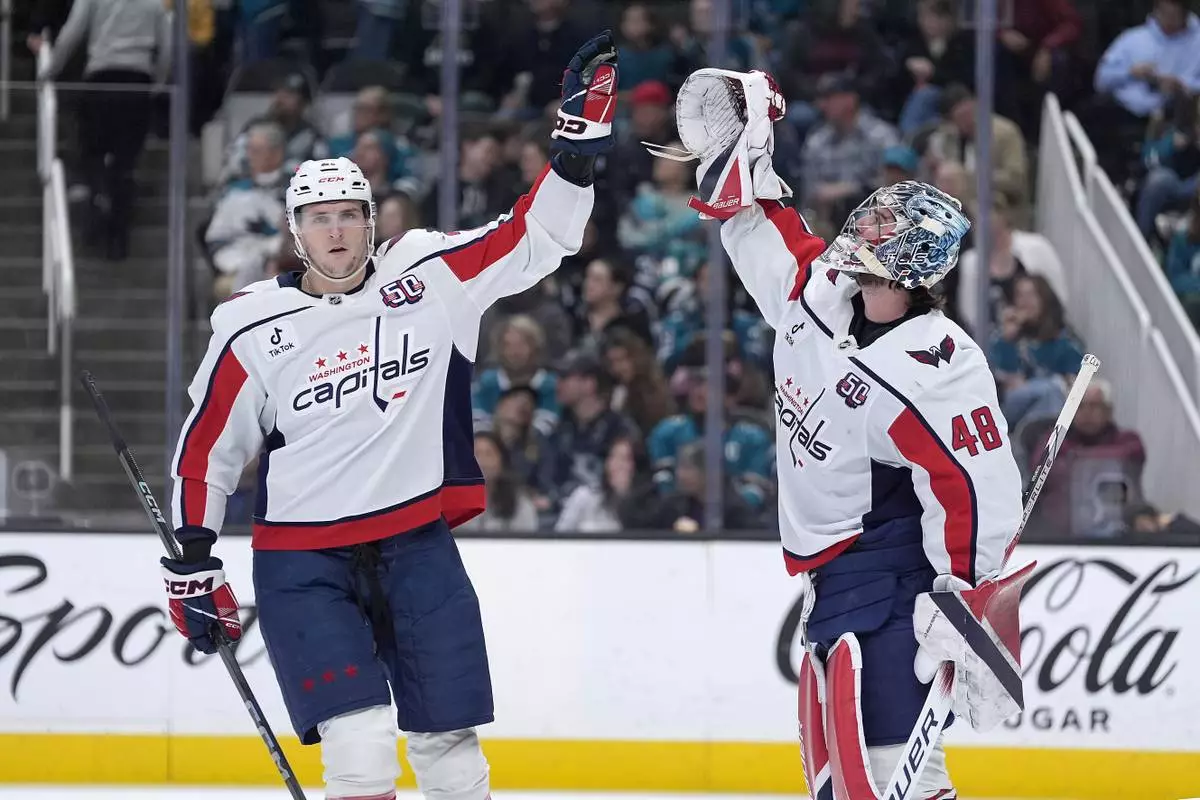 FILE - Washington Capitals center Aliaksei Protas, left, is congratulated by goaltender Logan Thompson (48) after scoring against the San Jose Sharks during the first period of an NHL hockey game in San Jose, Calif., Saturday, March 15, 2025. (AP Photo/Tony Avelar, File)