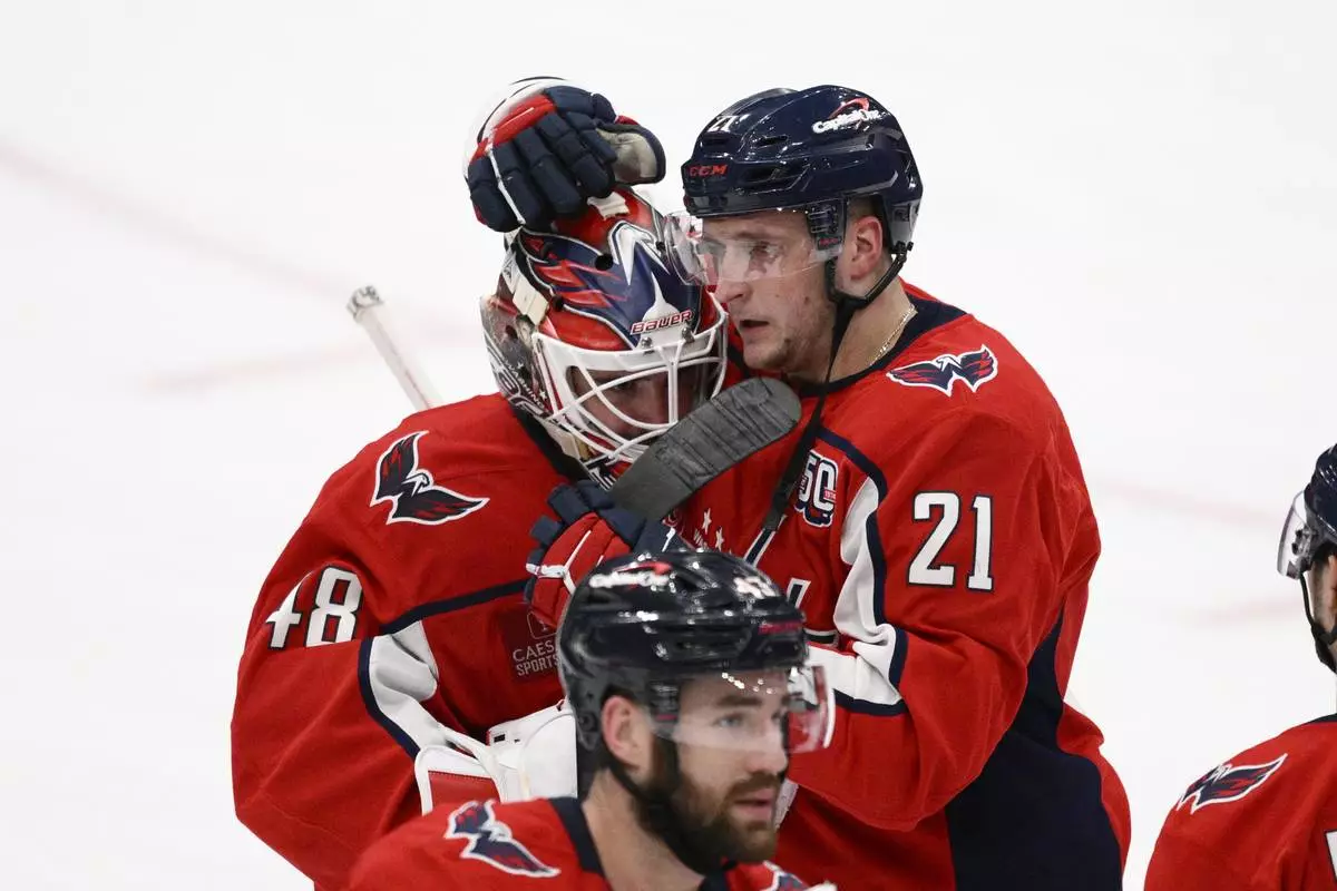 FILE - Washington Capitals center Aliaksei Protas (21) celebrates with goaltender Logan Thompson (48) after an NHL hockey game against the Detroit Red Wings, Friday, March 7, 2025, in Washington. (AP Photo/Nick Wass, File)
