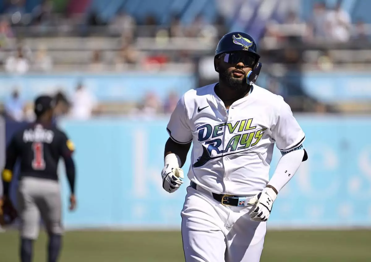 Tampa Bay Rays' Junior Caminero rounds the bases after his home run during the first inning of a baseball game against the Atlanta Braves, Saturday, April 12, 2025, in Tampa, Fla. (AP Photo/Jason Behnken)