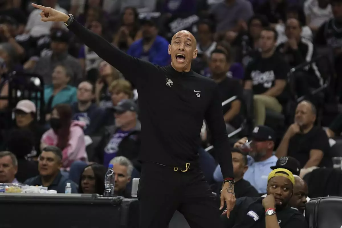 Sacramento Kings interim head coach Doug Christie reacts during the first half of an NBA basketball game Sunday, April 13, 2025, in Sacramento, Calif. (AP Photo/Scott Marshall)