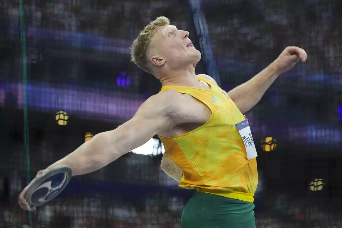 FILE - Mykolas Alekna, of Lithuania, competes in the 2024 Summer Olympics, Wednesday, Aug. 7, 2024, in Saint-Denis, France. (AP Photo/Bernat Armangue, File)