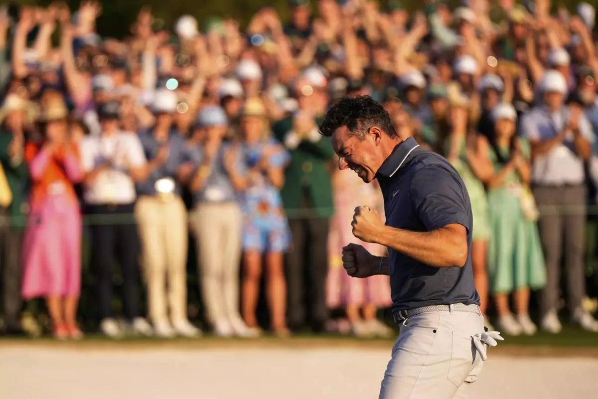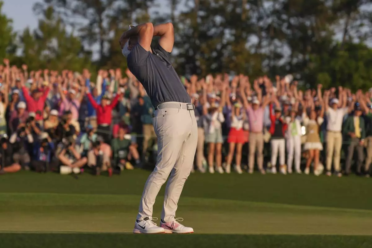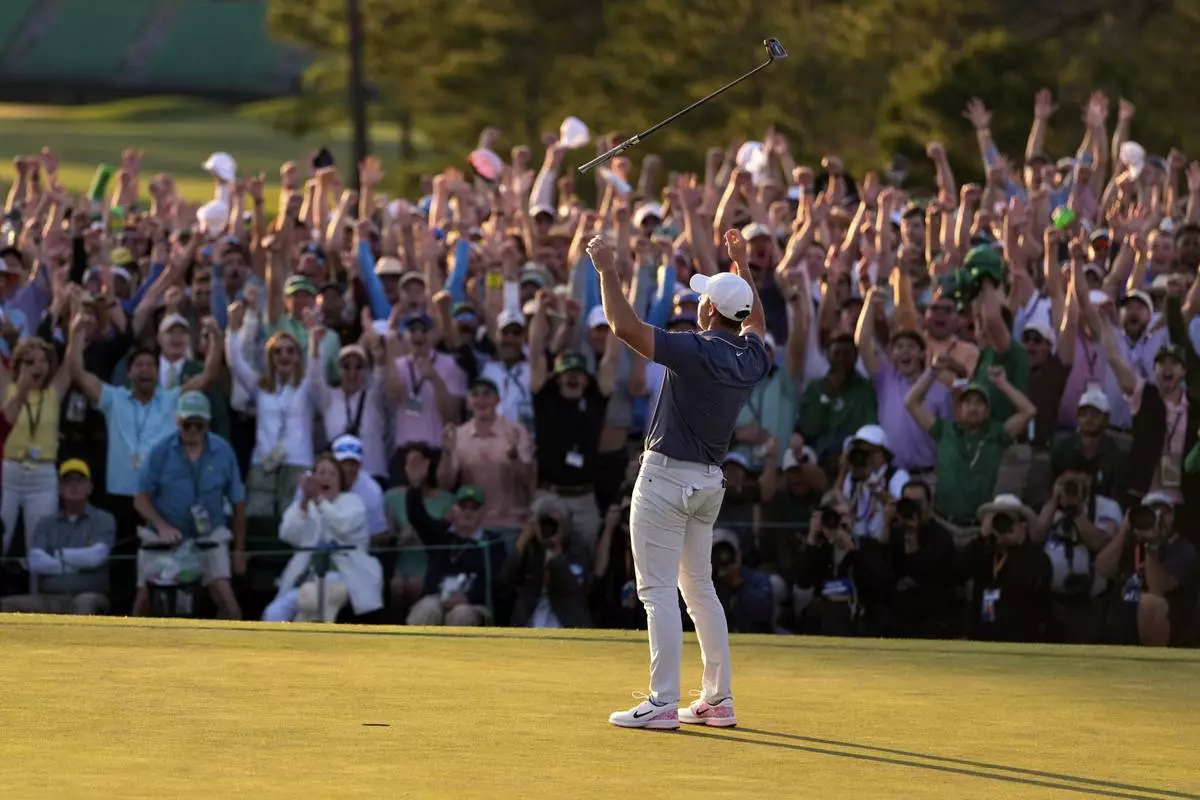 Rory McIlroy, of Northern Ireland, celebrates winning in a playoff against Justin Rose, of England, after the final round the Masters golf tournament, Sunday, April 13, 2025, in Augusta, Ga. (AP Photo/Matt Slocum)