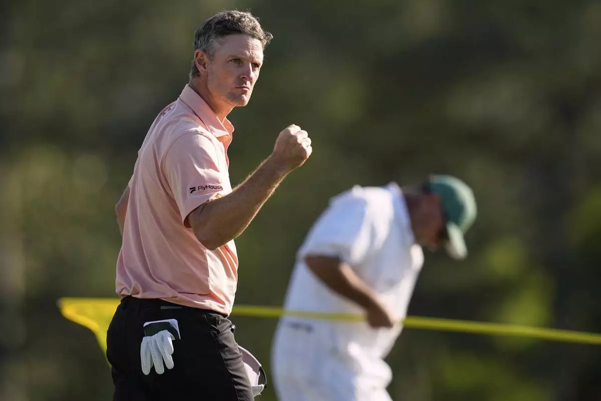 Justin Rose celebrates after a birdie on the 18th hole during the final round at the Masters golf tournament, Sunday, April 13, 2025, in Augusta, Ga. (AP Photo/Matt Slocum)