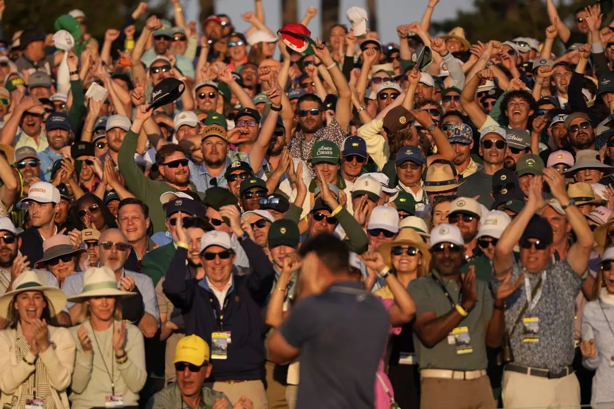 Patrons cheer as Rory McIlroy, of Northern Ireland, celebrates winning in a playoff against Justin Rose, of England, after the final round the Masters golf tournament, Sunday, April 13, 2025, in Augusta, Ga. (AP Photo/Julia Demaree Nikhinson)