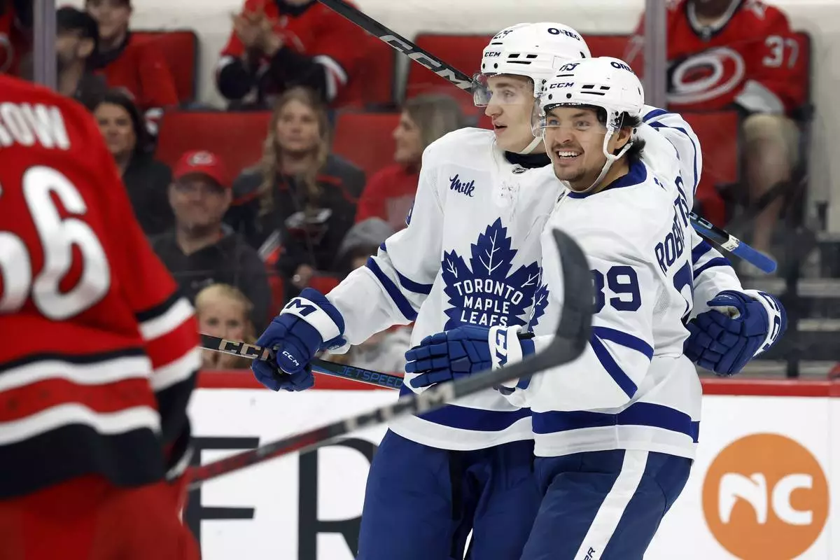 Toronto Maple Leafs' Pontus Holmberg, center, is congratulated on his goal by teammate Nicholas Robertson (89) during the first period of an NHL hockey game against the Carolina Hurricanes in Raleigh, N.C., Sunday, April 13, 2025. (AP Photo/Karl DeBlaker)