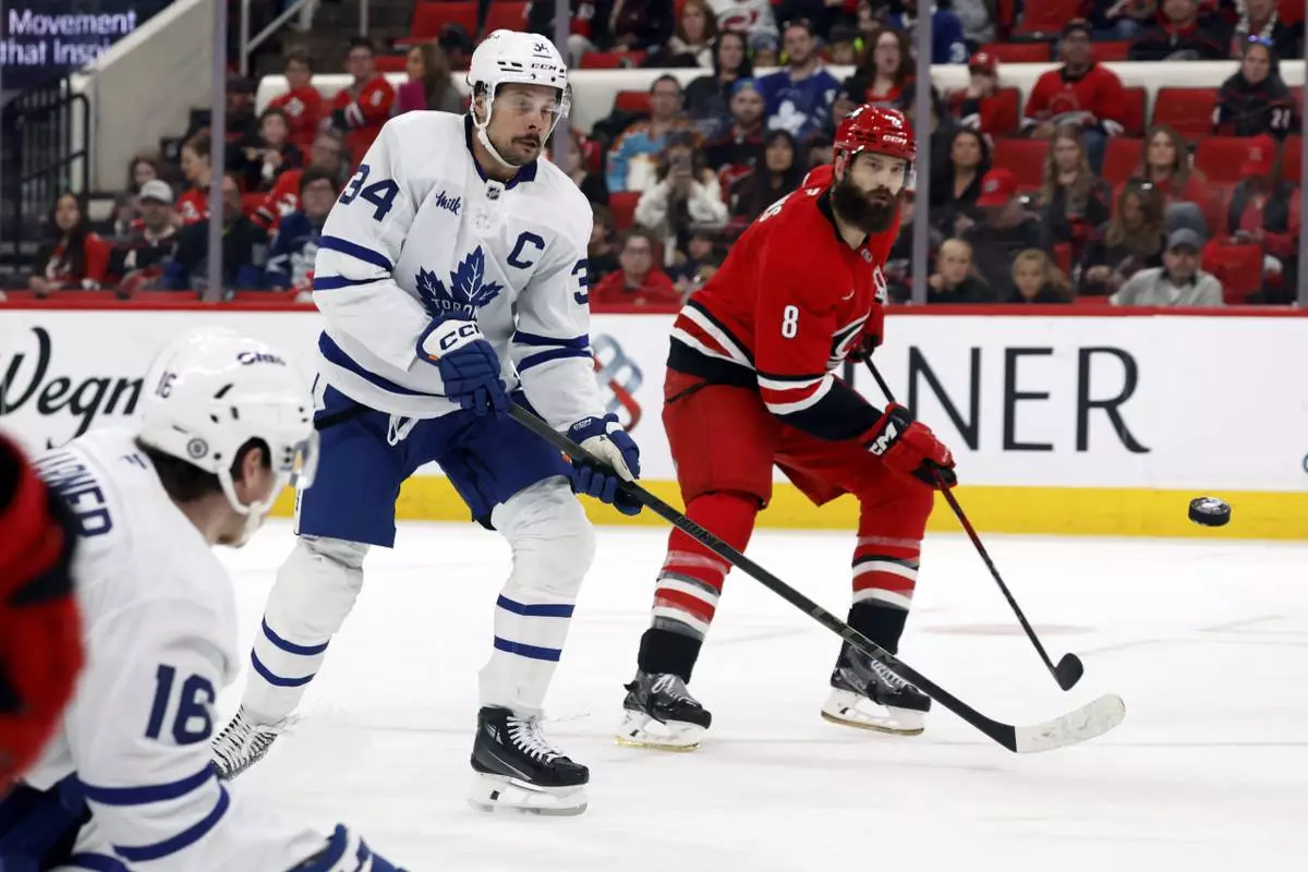 Carolina Hurricanes' Brent Burns (8) and Toronto Maple Leafs' Auston Matthews (34) watch the shot of Leafs' Mitch Marner (16) fly by during the second period of an NHL hockey game in Raleigh, N.C., Sunday, April 13, 2025. (AP Photo/Karl DeBlaker)