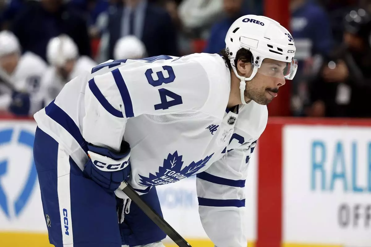 Toronto Maple Leafs' Auston Matthews (34) watches the puck against the Carolina Hurricanes during the first period of an NHL hockey game in Raleigh, N.C., Sunday, April 13, 2025. (AP Photo/Karl DeBlaker)