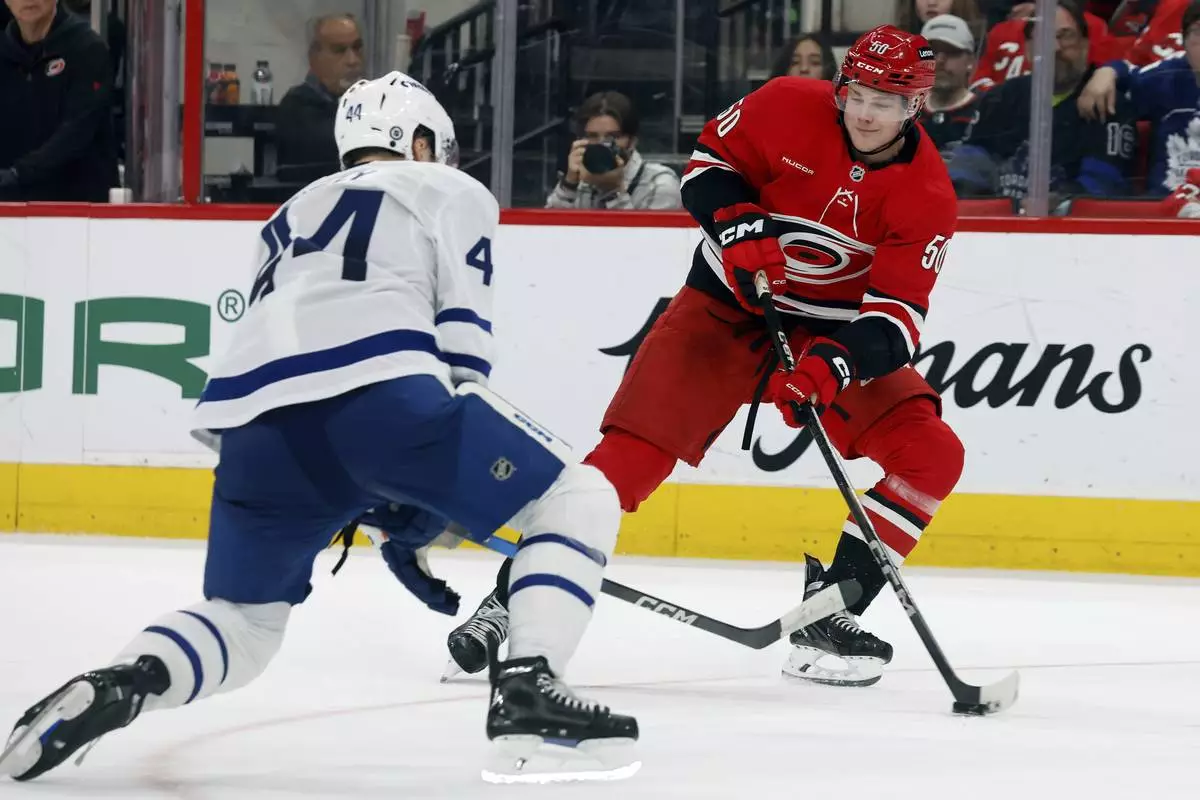 Carolina Hurricanes' Eric Robinson (50) controls the puck near Toronto Maple Leafs' Morgan Rielly (44) during the second period of an NHL hockey game in Raleigh, N.C., Sunday, April 13, 2025. (AP Photo/Karl DeBlaker)
