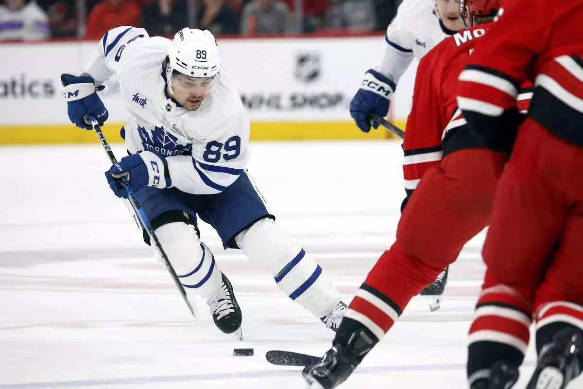 Toronto Maple Leafs' Nicholas Robertson (89) moves the puck against the Carolina Hurricanes during the first period of an NHL hockey game in Raleigh, N.C., Sunday, April 13, 2025. (AP Photo/Karl DeBlaker)