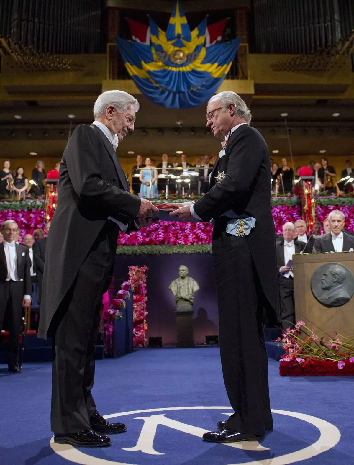 FILE - Peruvian Nobel literature laureate Mario Vargas Llosa, left, receives the Nobel Prize in Literature from Swedish King Carl XVI Gustaf, right, at the Concert Hall in Stockholm, Dec. 10, 2010. (Henrik Montgomery/TT News Agency via AP, File)