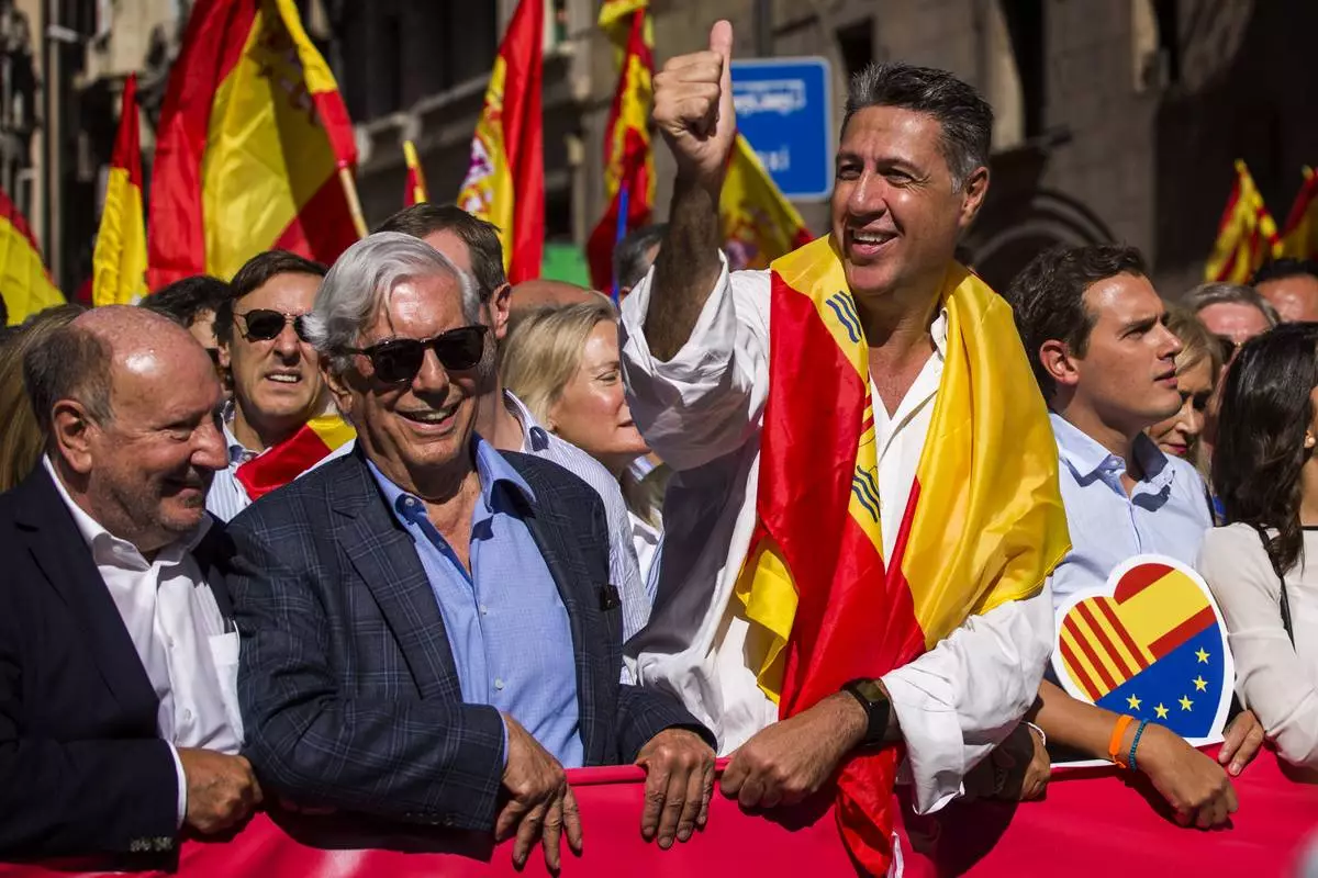 FILE - Nobel laureate Mario Vargas Llosa, second from left, stands next to Popular Party leader in Catalonia Xavier Garcia Albiol, right, as they lead a march to protest the Catalan government's push for secession from the rest of Spain in downtown Barcelona, Spain, Oct. 8, 2017. (AP Photo/Emilio Morenatti, File)