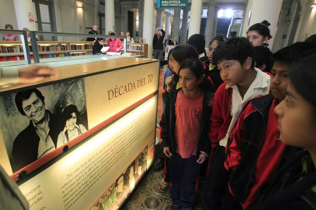 FILE - Students learn about Peruvian writer Mario Vargas Llosa at a public library in Lima, Peru, Oct. 7, 2010. (AP Photo/Martin Mejia, File)