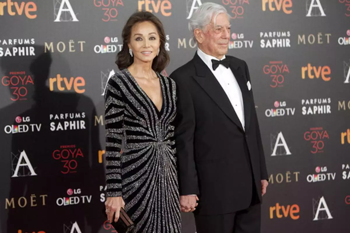 FILE - Isabel Preysler, left, and writer Mario Vargas Llosa arrive at the red carpet of the Goya Film Awards Ceremony in Madrid, Spain, Feb. 6, 2016. (AP Photo/Abraham Caro Marin, File)