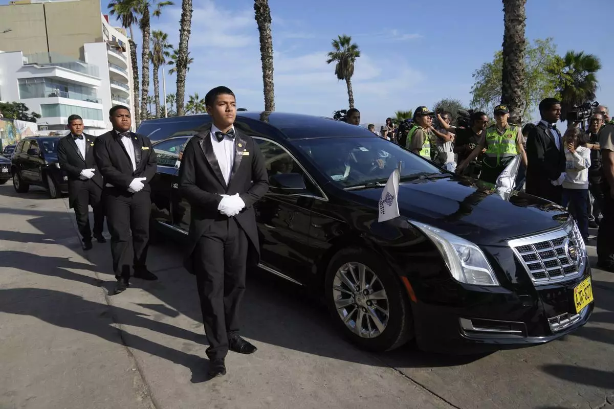 Funeral workers stand beside a hearse driving the coffin of Peruvian Nobel literature laureate Mario Vargas Llosa to a crematorium in Lima, Peru, Monday, April 14, 2025. (AP Photo/Martin Mejia)