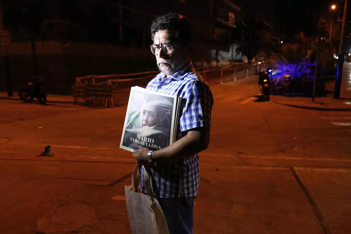Gabriel Rimachi holds an issue of the literary magazine he directs, dedicated to Peruvian Nobel literature laureate Mario Vargas Llosa, after the announcement of the writer's death at the age of 89, in front of his home in Lima, Peru, Sunday, April 13, 2025. (AP Photo/Martin Mejia)
