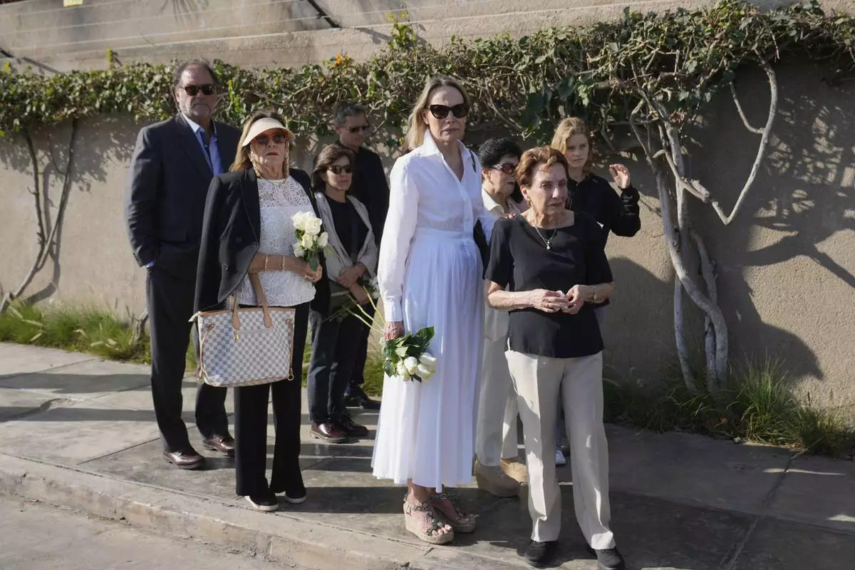 Family and friends watch a hearse transport the coffin of Peruvian Nobel literature laureate Mario Vargas Llosa to a crematorium in Lima, Peru, Monday, April 14, 2025. (AP Photo/Martin Mejia)