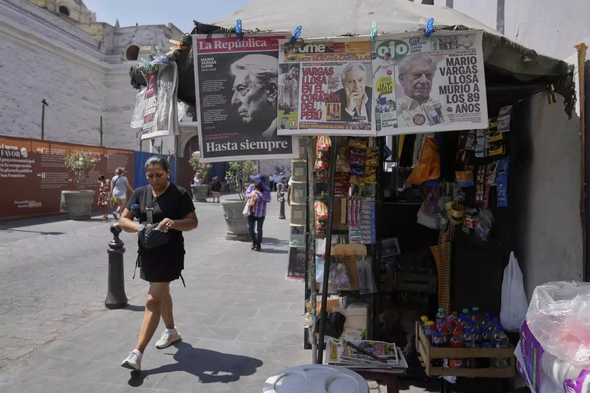 Newspapers for sale carry the news of the death of Peruvian author and Nobel literature laureate Mario Vargas Llosa at a kiosk in Lima, Peru, Monday, April 14, 2025. (AP Photo/Martin Mejia)