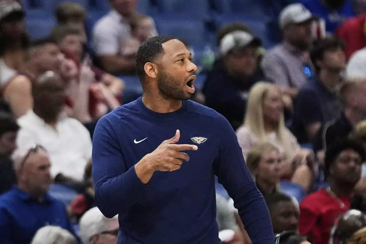New Orleans Pelicans head coach Willie Green calls out from the bench in the first half of an NBA basketball game against the Oklahoma City Thunder in New Orleans, Sunday, April 13, 2025. (AP Photo/Gerald Herbert)