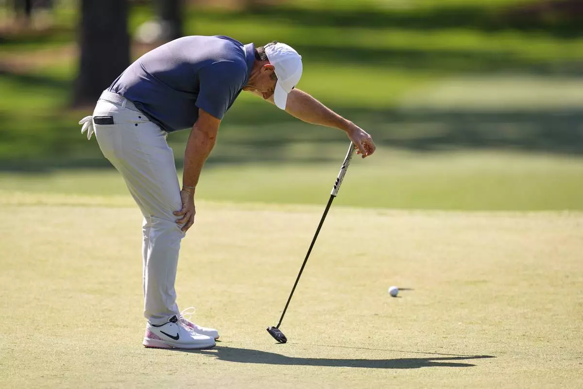 Rory McIlroy, of Northern Ireland, reacts after missing a putt on the 13th hole during the final round at the Masters golf tournament, Sunday, April 13, 2025, in Augusta, Ga. (AP Photo/Julia Demaree Nikhinson)