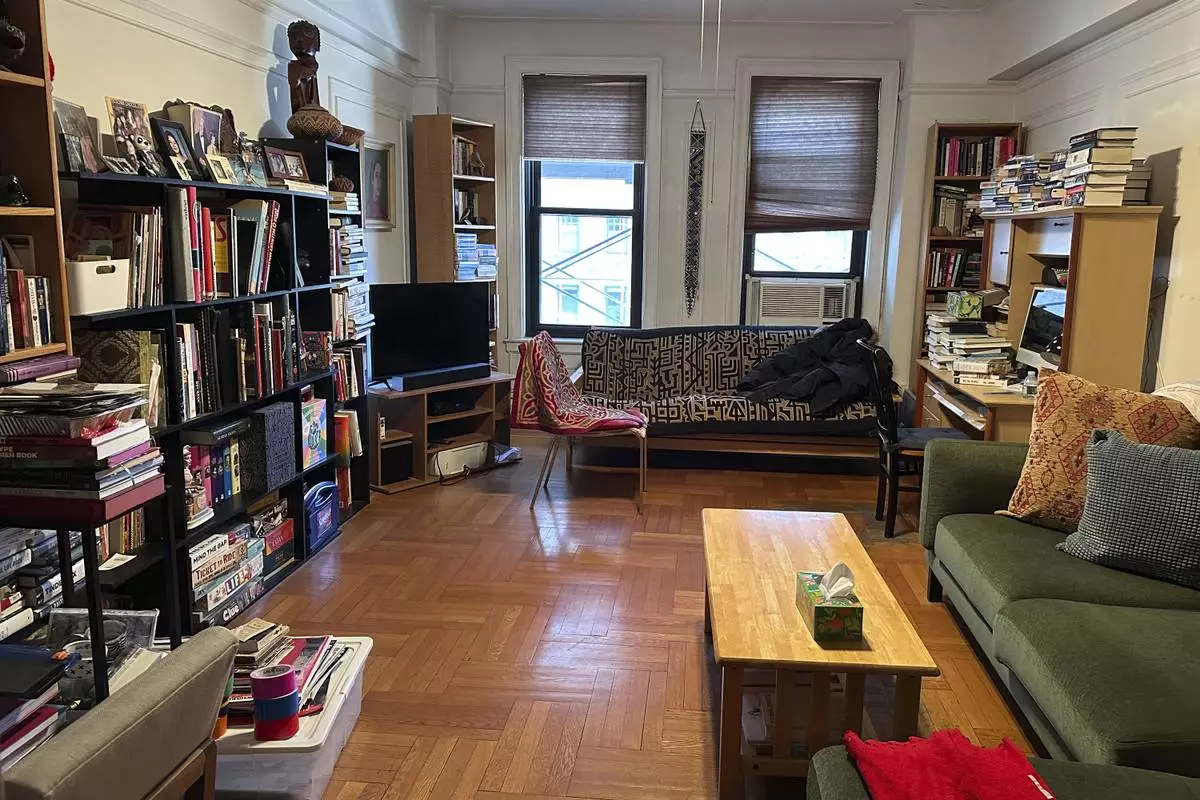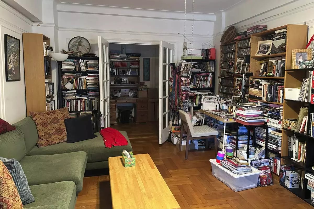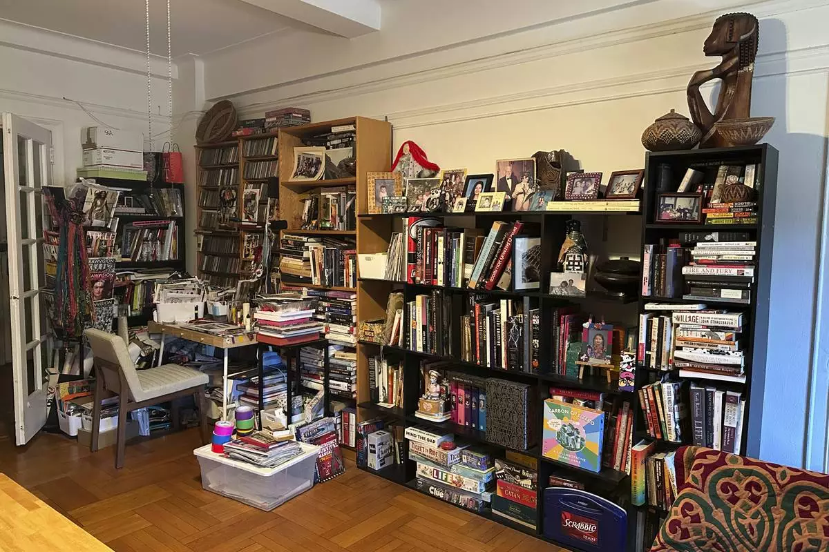 A cluttered living room appears in New York on Tuesday, April 8, 2025. (AP Photo/Leanne Italie)