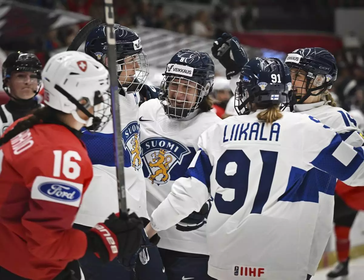 Finnish players celebrate their first goal during the IIHF Women's World Championship, Group A, match between Switzerland and Finland, in Ceske Budejovice, Czech Republic, Monday April 14, 2025. (Lubos Pavlicek/CTK via AP)