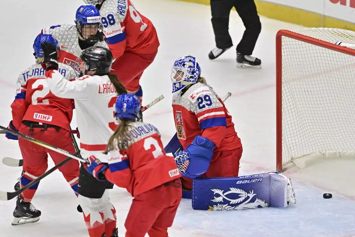 Czech Republic goalkeeper Klara Peslarova, right, fails to save a goal during the IIHF Women's World Championship, Group A, match between Czech Republic and Canada, in Ceske Budejovice, Czech Republic, Monday, April 14, 2025. (Vaclav Pancer/CTK via AP)