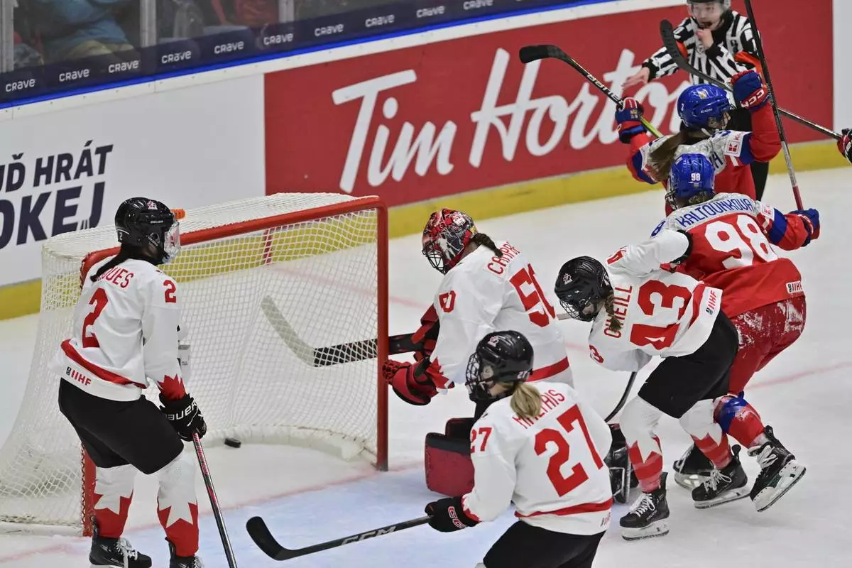 Czech Republic's Adela Sapovalivova, top right, celebrates her goal against Canada goalkeeper Kristen Campbell, center, during the IIHF Women's World Championship, Group A, match between Czech Republic and Canada, in Ceske Budejovice, Czech Republic, Monday, April 14, 2025. (Vaclav Pancer/CTK via AP)