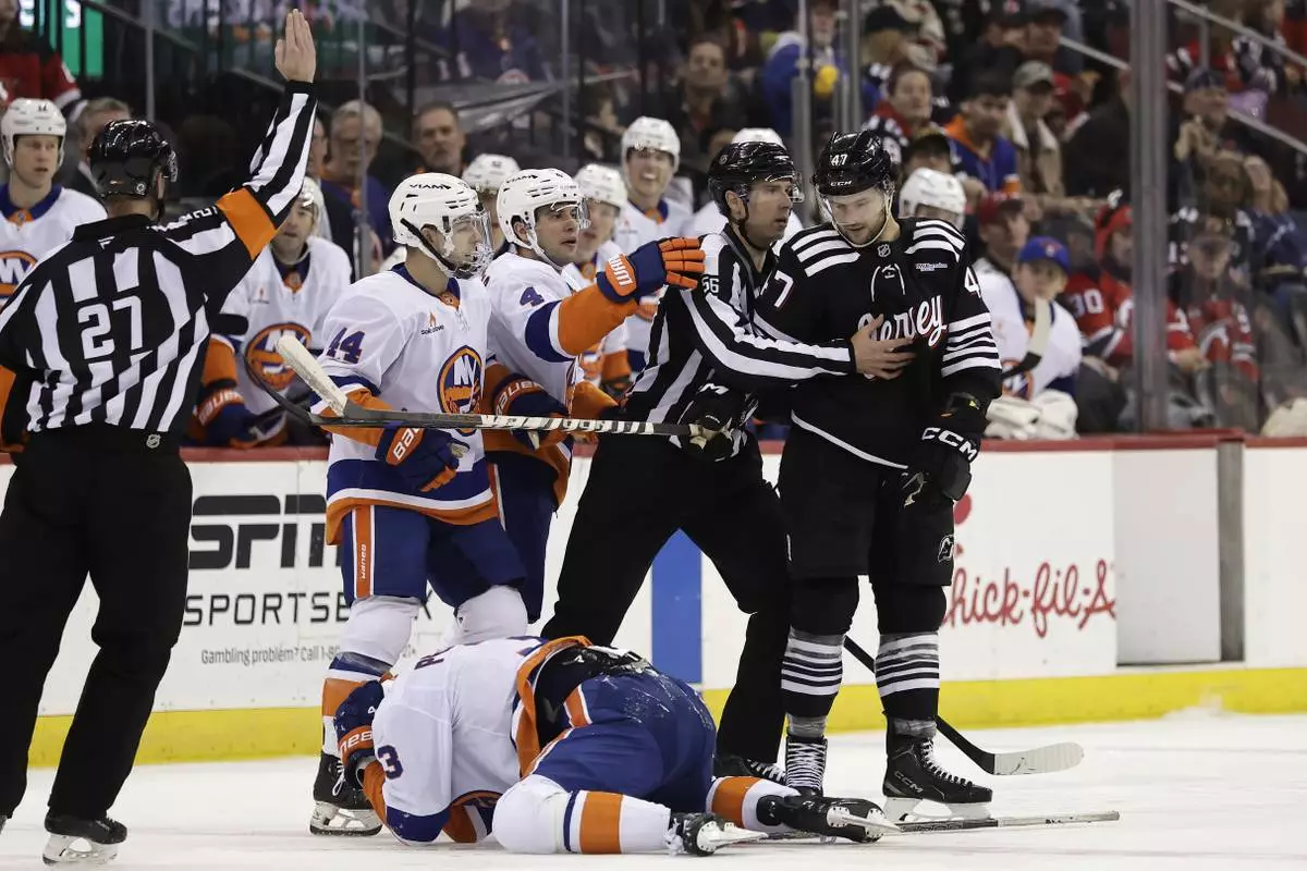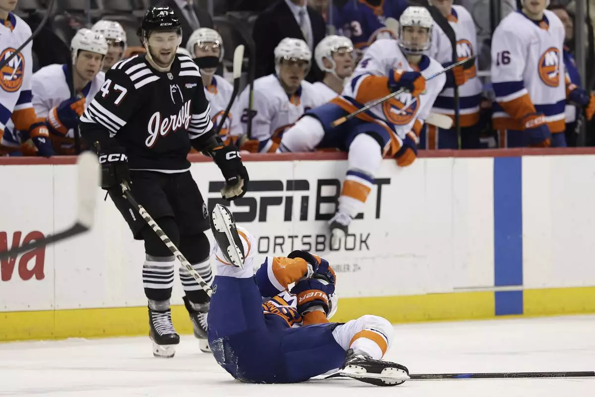 New York Islanders defenseman Adam Pelech (3) lays on the ice after being hit by New Jersey Devils center Paul Cotter (47) in the second period of an NHL hockey game Sunday, April 13, 2025, in Newark, N.J. (AP Photo/Adam Hunger)