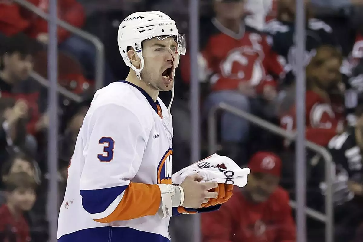 New York Islanders defenseman Adam Pelech (3) yells after being hit by New Jersey Devils center Paul Cotter in the second period of an NHL hockey game Sunday, April 13, 2025, in Newark, N.J. (AP Photo/Adam Hunger)