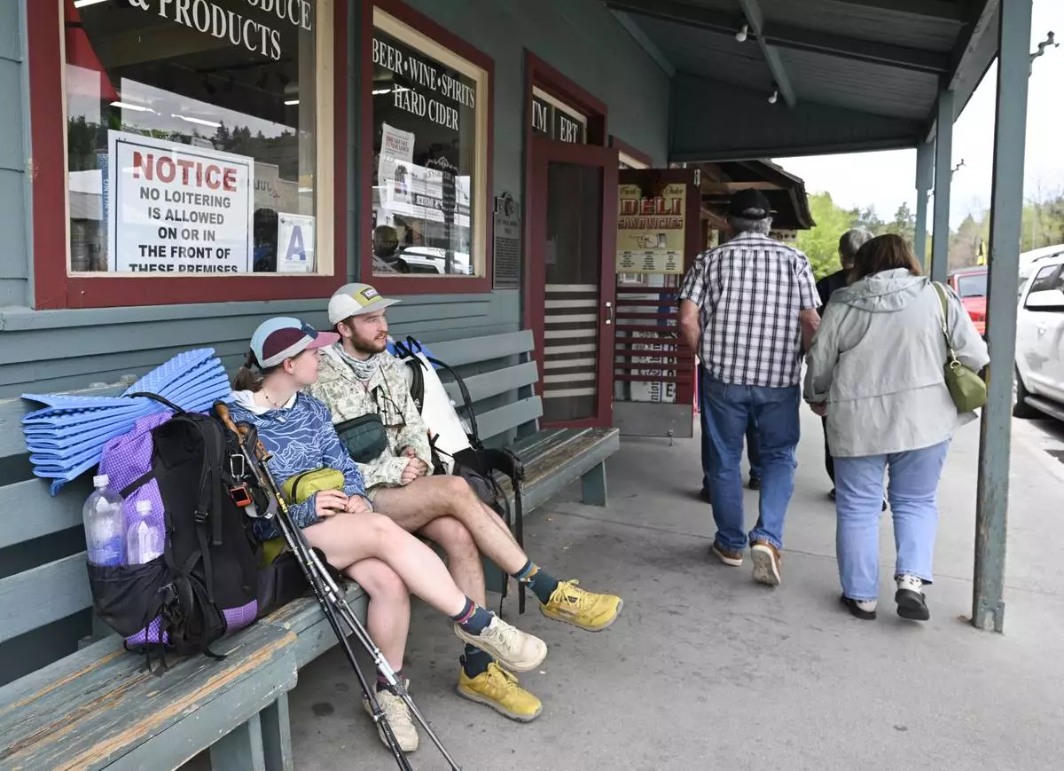 Celia Peterson, left, and Jensen Douillard wait before going on a hike Monday, April 14, 2025, in Julian, Calif., after an earthquake hit in San Diego County. (AP Photo/Denis Poroy)