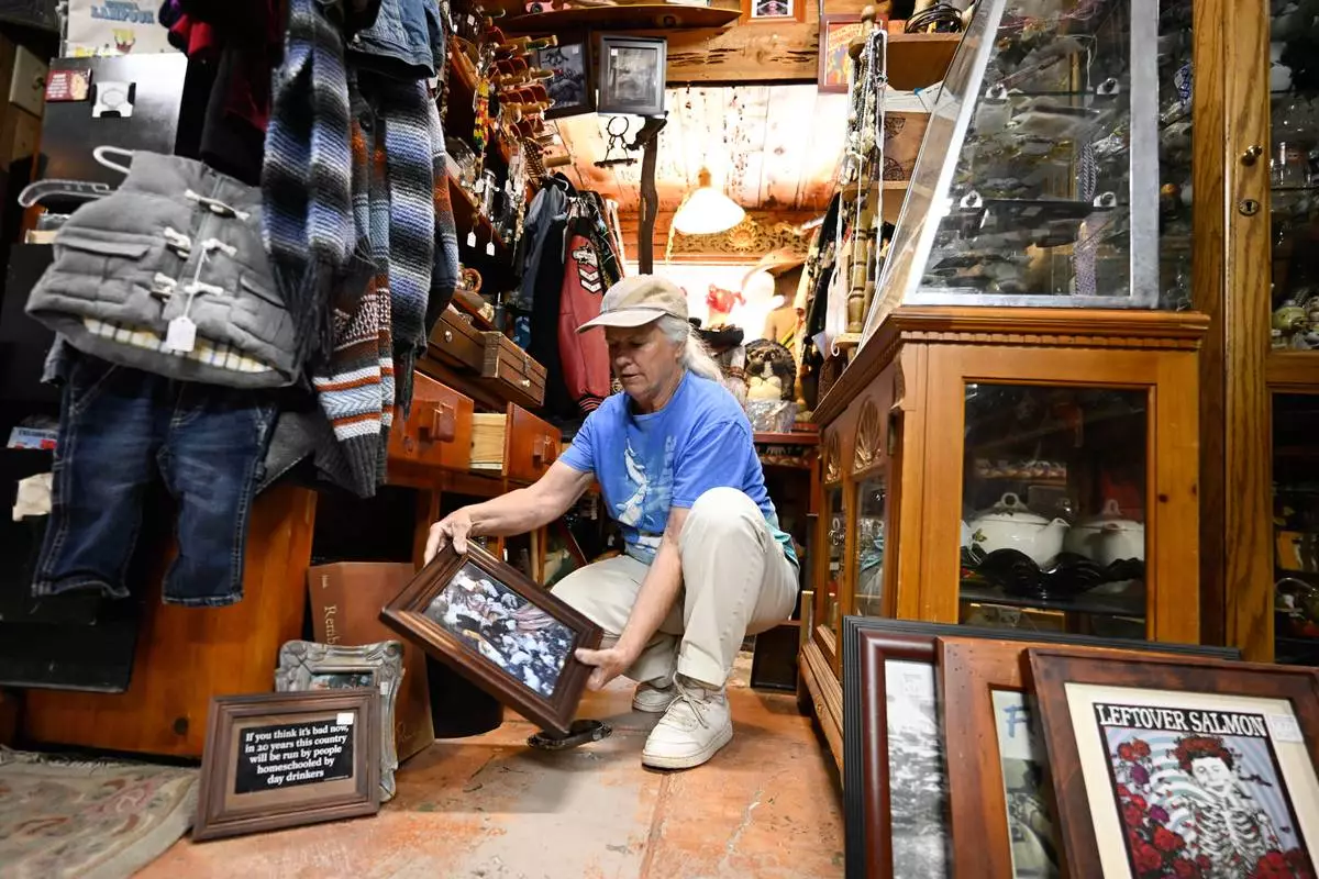 Tracy Turner, owner of the Wynola Junction, looks over pictures that fell from shelves when a earthquake hit Monday, April 14, 2025, in Julian, Calif., after an earthquake shook Southern California, sending boulders tumbling onto rural roadways outside San Diego and rattling items off shelves and walls. (AP Photo/Denis Poroy)