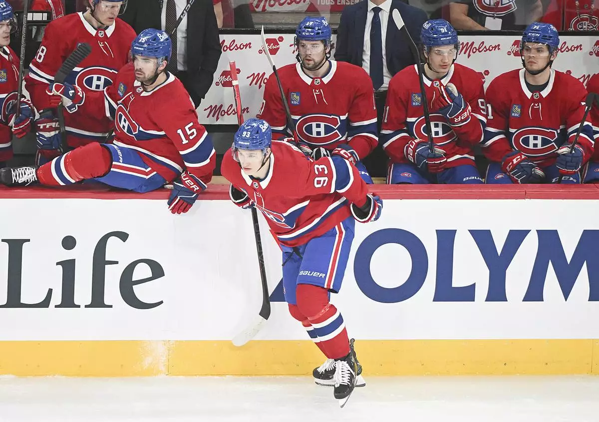 Montreal Canadiens' Ivan Demidov (93) comes off the bench during first-period NHL hockey game action against the Chicago Blackhawks in Montreal, Monday, April 14, 2025. (Graham Hughes/The Canadian Press via AP)
